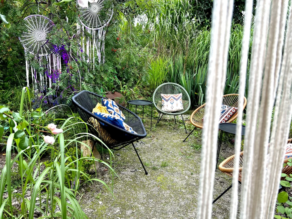 Drewniana Altanka: W jednym z rogów ogrodu postawiliśmy piękną, drewnianą altankę. Jej rustykalny urok wprowadził do przestrzeni ciepły i przytulny klimat, idealny na bardziej kameralne rozmowy i chwilę odpoczynku.