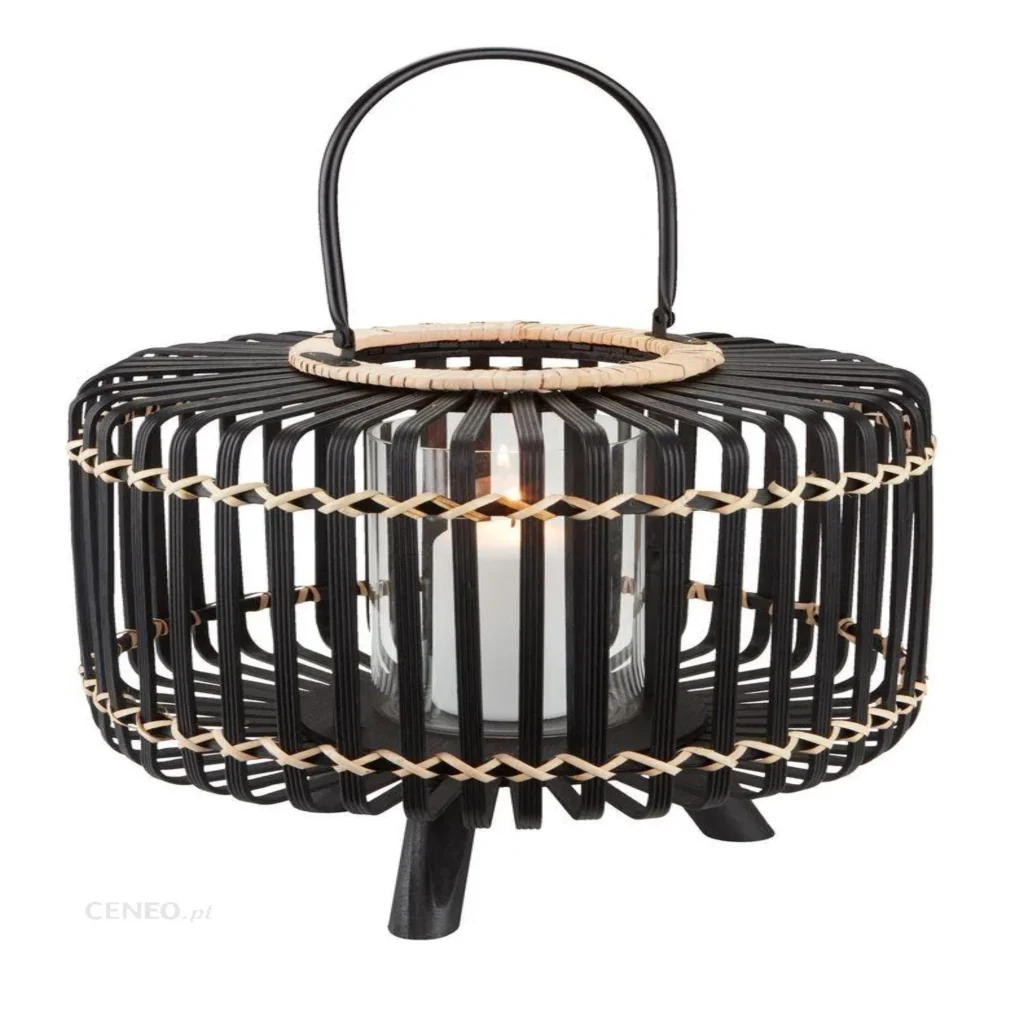 Cudownie uzupełnieni aranżacje w każdym domu, ogrodzie, tarasie czy balkonie, współgra z wystrojem w przestrzeniach boho lub eko. Pleciony, bambusowy koszyk lampionu ma czarny kolor drewna, a mocny, metalowy uchwyt pozwoli powiesić lampion. Wysoki wkład na świecę, wykonany ze szkła, gwarantuje bezpieczeństwo podczas jej palenia się.