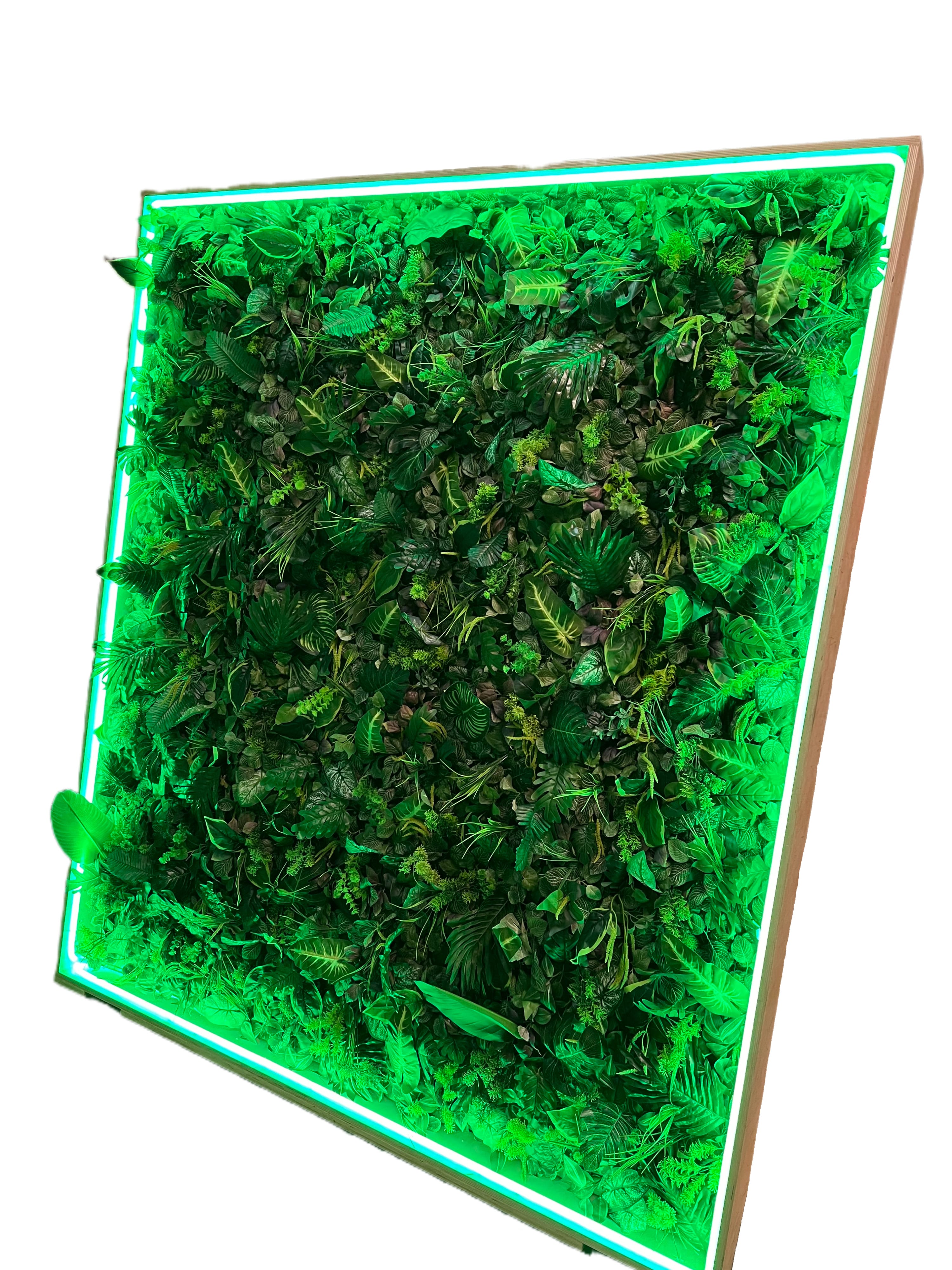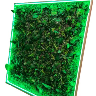 Staranność wykonania oraz wysoka jakość materiałów sprawiają, że liście rośliny wyglądają bardzo realistycznie i atrakcyjnie. Panel wykonany na drewnianej ramie dodatkowo obramowany jest zielonym światłem LED, które nadaje subtelnej harmonii. Sprawdzi się idealnie jako element dekoracyjny najróżniejszych aranżacji oraz doda otoczeniu naturalnej i przytulnej atmosfery.